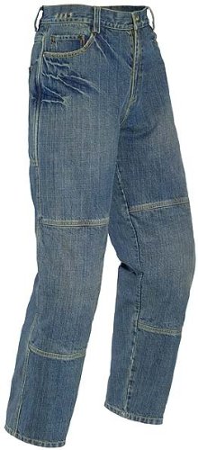 * * Features * * * 13.5 oz distressed denim construction provides comfortable durability.* Perforated leather panels are used as lining in the impact areas to provide added protection.* Double stitched construction throughout.* Single button fly and zipper closure.* Removable CE approved knee armor with an adjustable positioning system.* Traditional five pocket design two rear pockets two hand pockets and a change pocket.* Belt loops allow the secure addition of a waist belt not included.