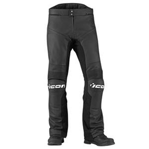 Icon Overlord Prime Leather Pants Crafted from the same 1.2-1.4 mm leather as our Overlord jacket, the Overlord leather pant is more than durable enough for the most brutal of street duty. The street specific pattern accommodates the aggressive ergonomics of modern sport bikes while greatly reducing the all too common butt sag when standing. Mechanical flex zones and integrated stretch Cordura panels enhance on-bike mobility. Over the boot leg patterns eliminate the racetrack refugee look by allowing your boots to fit under the pant. The integrated plastic knee armor provides enhanced joint abrasion protection should you decide to put these pants to the ultimate test. A three quarter length zipper allows the pant to be connected to any of the Overlord leather jackets. ICON relaxed fit